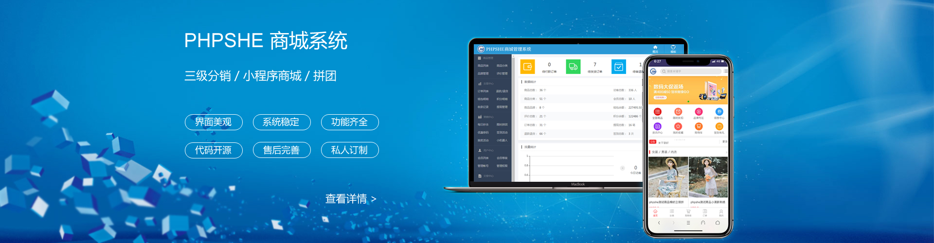 PHPSHE是一款支持三級分銷的商城系統, 支持自營、聯營、招商等多種運營模式,并擁有零售、拼團等多種業務模式,幫助企業低成本快速構建在線商城,在PC、APP、微信等環境下開啟電子商務業務。